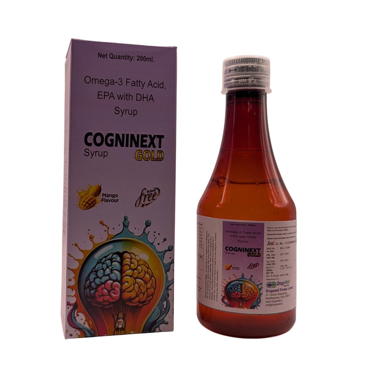 Cogninext Gold Syrup by DrugsWell is a premium sugar-free brain health supplement featuring concentrated Omega-3 fatty acids (EPA & DHA) that support enhanced memory, focus, and cognitive performance for all ages. This delicious mango-flavored syrup combines essential brain nutrients with carefully selected excipients including Xanthan Gum for smooth texture, Sodium Benzoate for freshness, MPS and PPS for antimicrobial protection, Bronopol for broad-spectrum preservation, and Sodium Saccharin with Aspartame for calorie-free sweetness. Designed for students, professionals, and health-conscious individuals seeking cognitive support, Cogninext Gold delivers scientifically-backed brain nutrition in a safe, effective, and great-tasting formula that maintains stability and potency throughout its shelf life. Take as directed by your healthcare professional for optimal cognitive wellness and mental clarity.
