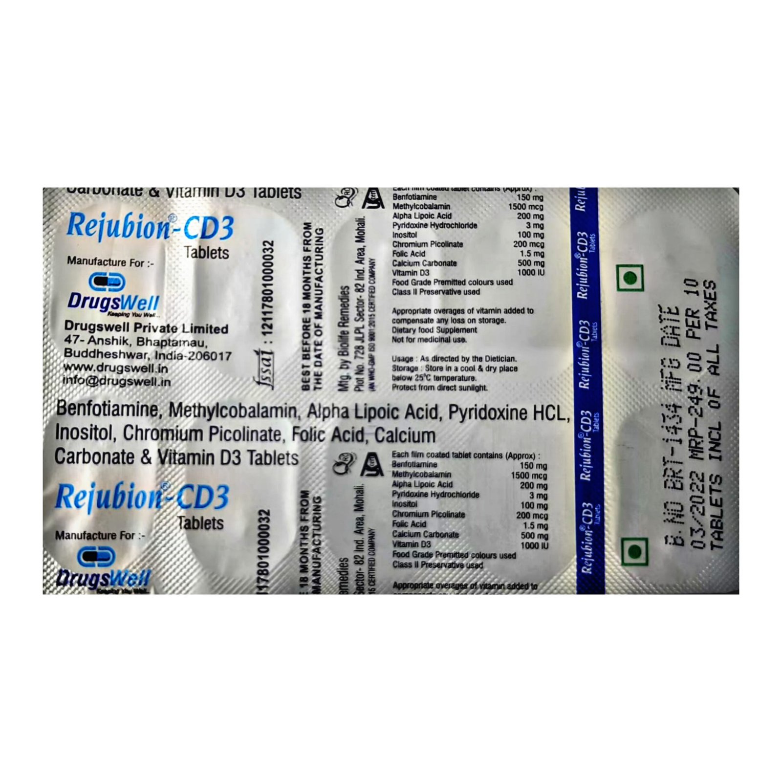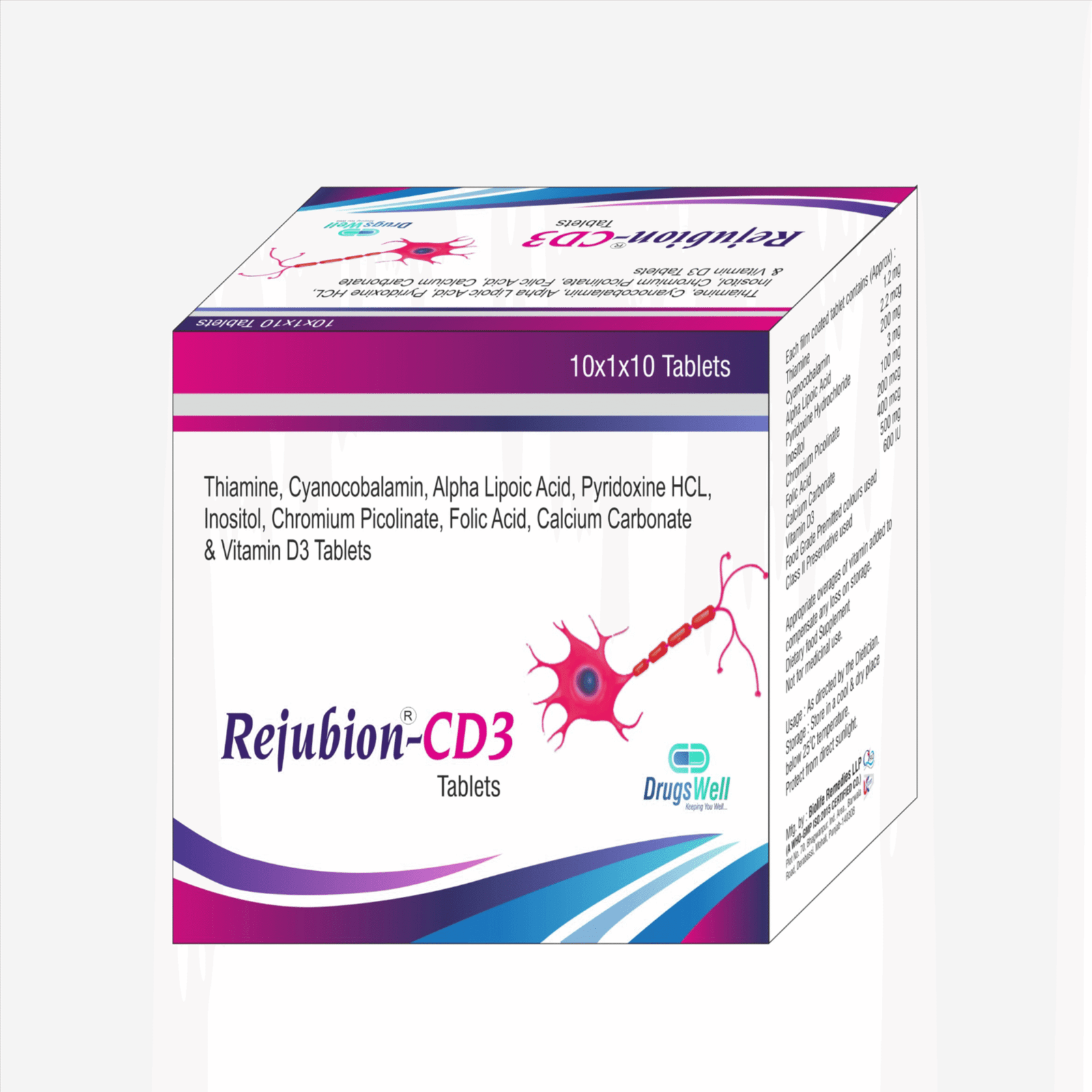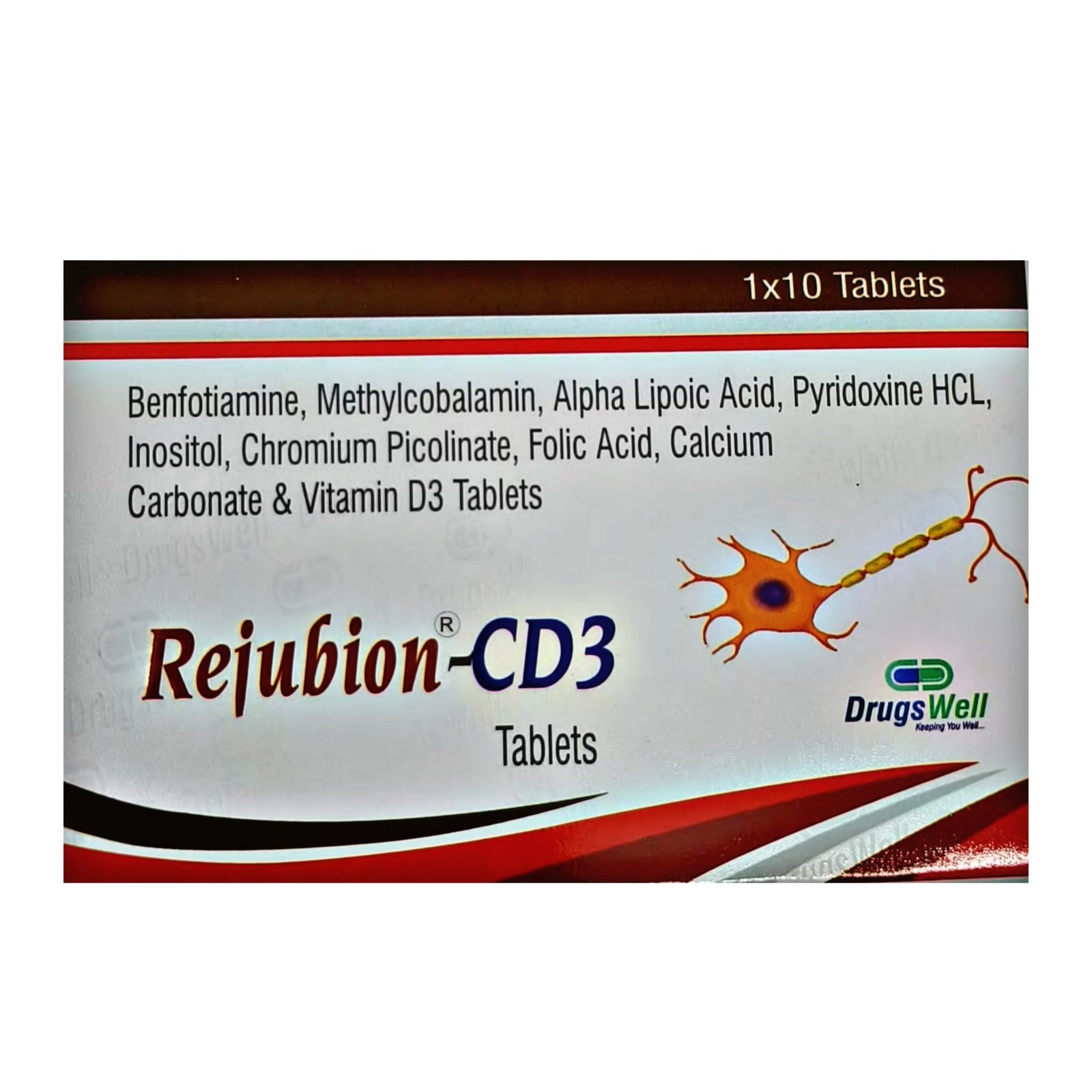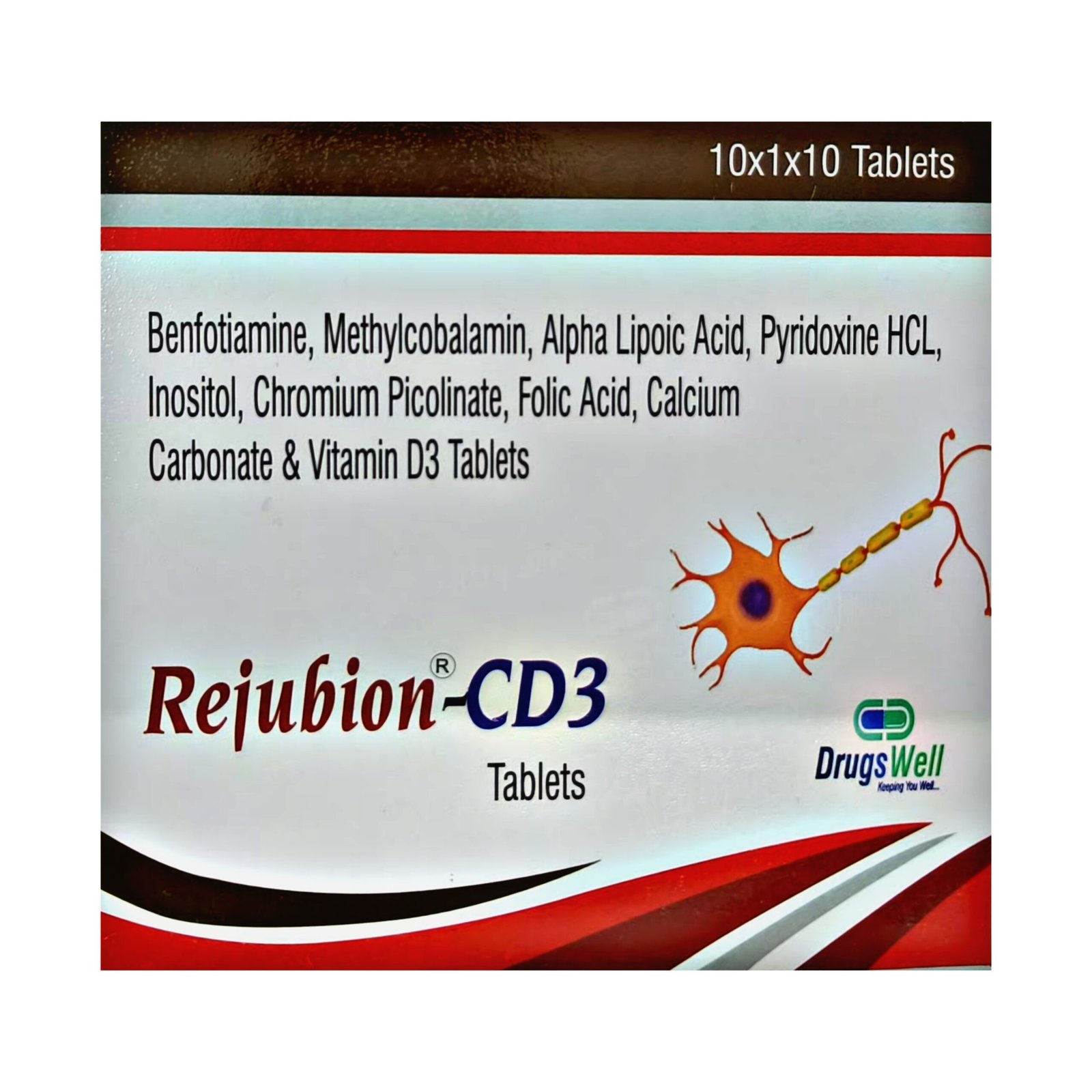 Rejubion CD3 Tablet is a nutritional supplement that nourishes the body with essential vitamins and minerals. It contains calcium carbonate, vitamin D3 (cholecalciferol), pyridoxine (vitamin B6), folic acid, methylcobalamin (vitamin B12), alpha-lipoic acid, chromium, benfotiamine, and inositol. It is indicated in bone-related disorders and to treat nerve pain and nerve damage in peripheral neuropathy, diabetic neuropathy (nerve damage due to high blood sugar levels), and alcoholic neuropathy. It also improves memory and prevents brain atrophy.